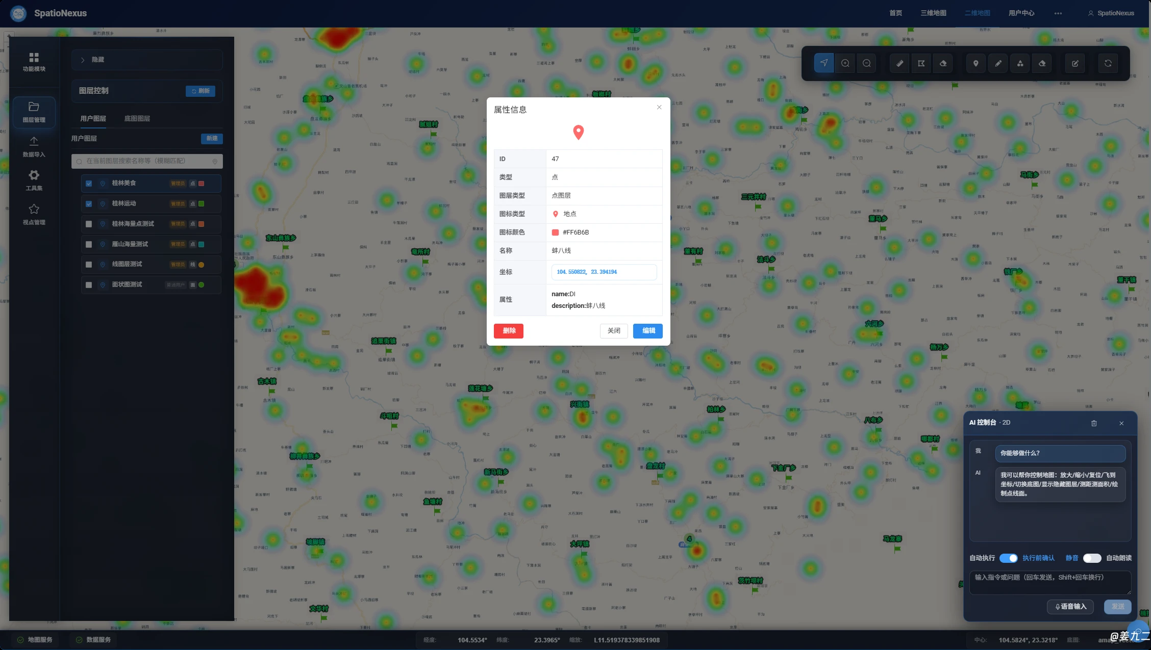 团队自主研发了由AI驱动的二三维地球引擎“SpatioNexus - 3D”。该引擎基于Cesium和OpenLayers进行深度优化,具备支持亿级三维面片渲染以及十万级条目数据高效处理的能力。同时,它能够对所有常见类别空间数据进行托管、服务发布和第三方授权。团队自研的MCP工具可与二三维引擎实现无缝集成,借助语音及自然语言交互的方式,达成地理空间操作以及推理分析,显著降低了非专业人员的使用门槛。后续,将开放大屏业务AI自主定制模块,以支持业务大屏的人工智能辅助构建。